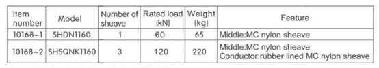 2.Sheave Dimension for conductor ( outside diameterx root diameter x sheave width) Φ1160xΦ1000x150(mm).